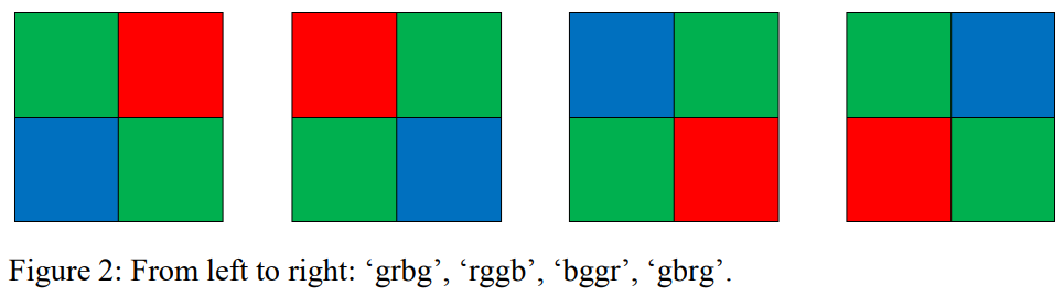 top-left bottom-right ("grbg" and "gbrg") or the top-right bottom-left ("rggb" and "bggr") pattern