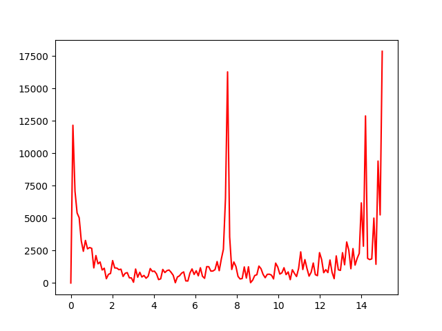 plt.plot(f, np.abs(yiq_video_averaged_fft)[(FRAME_COUNT + 1) // 2:], color='r')