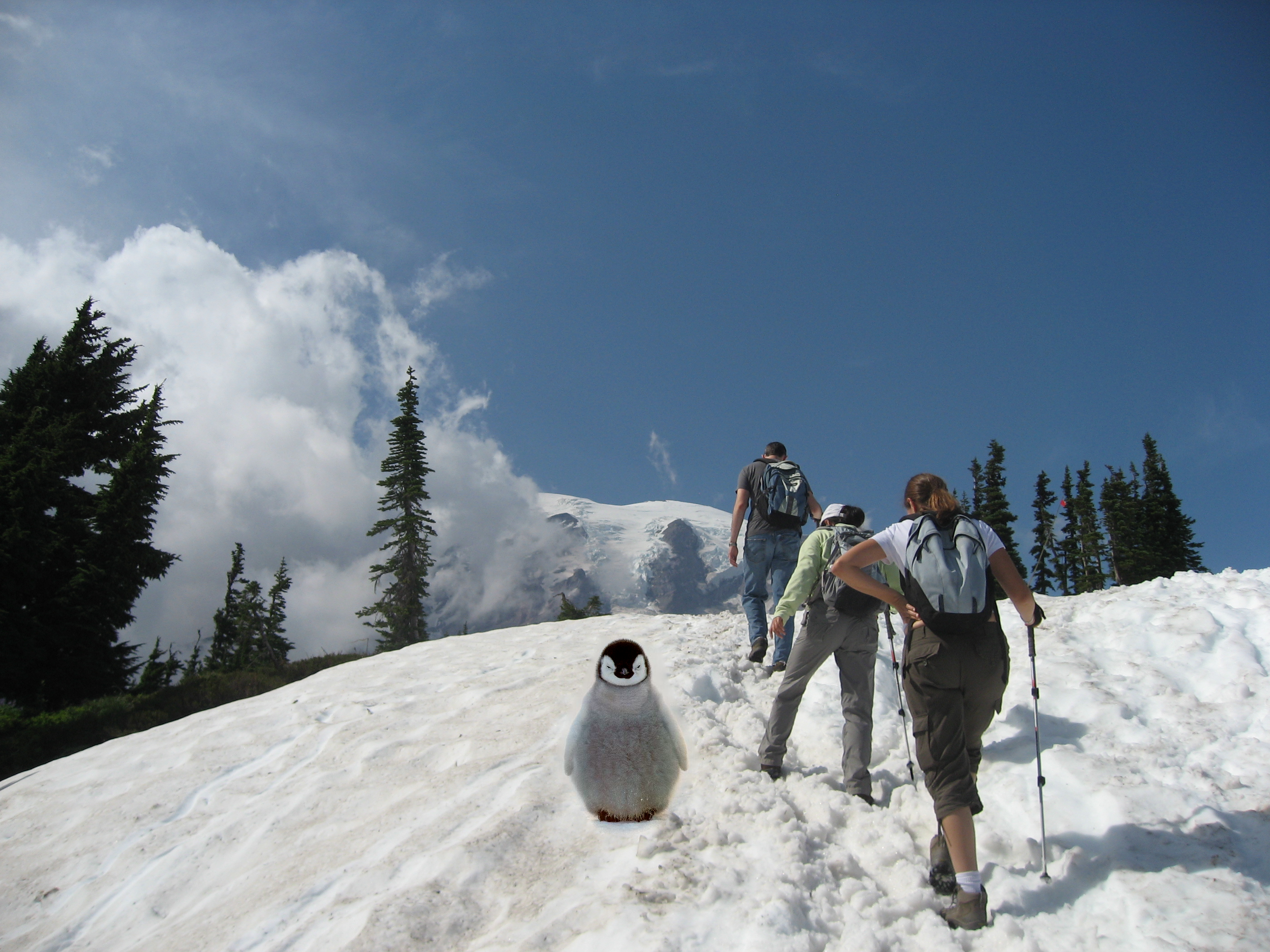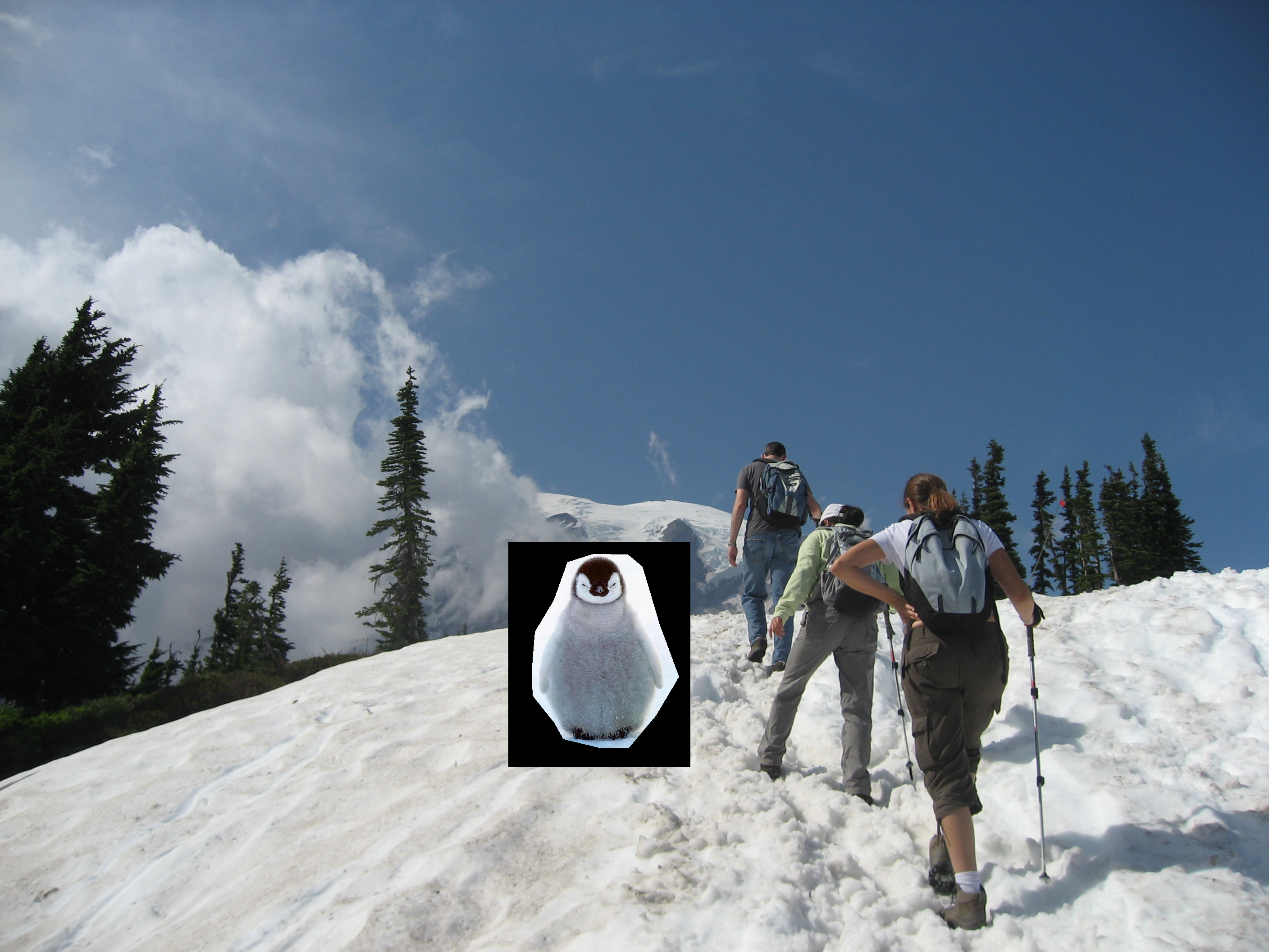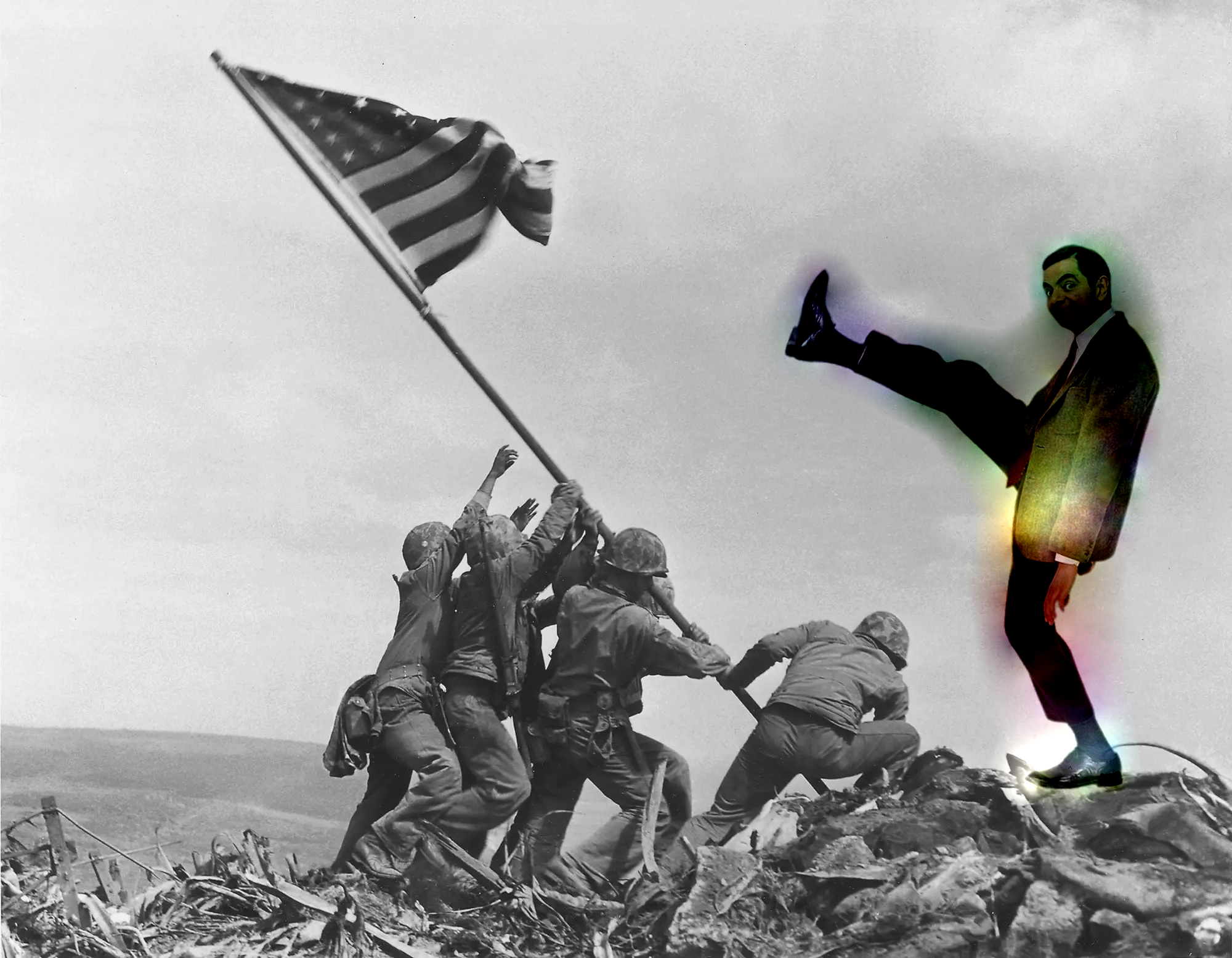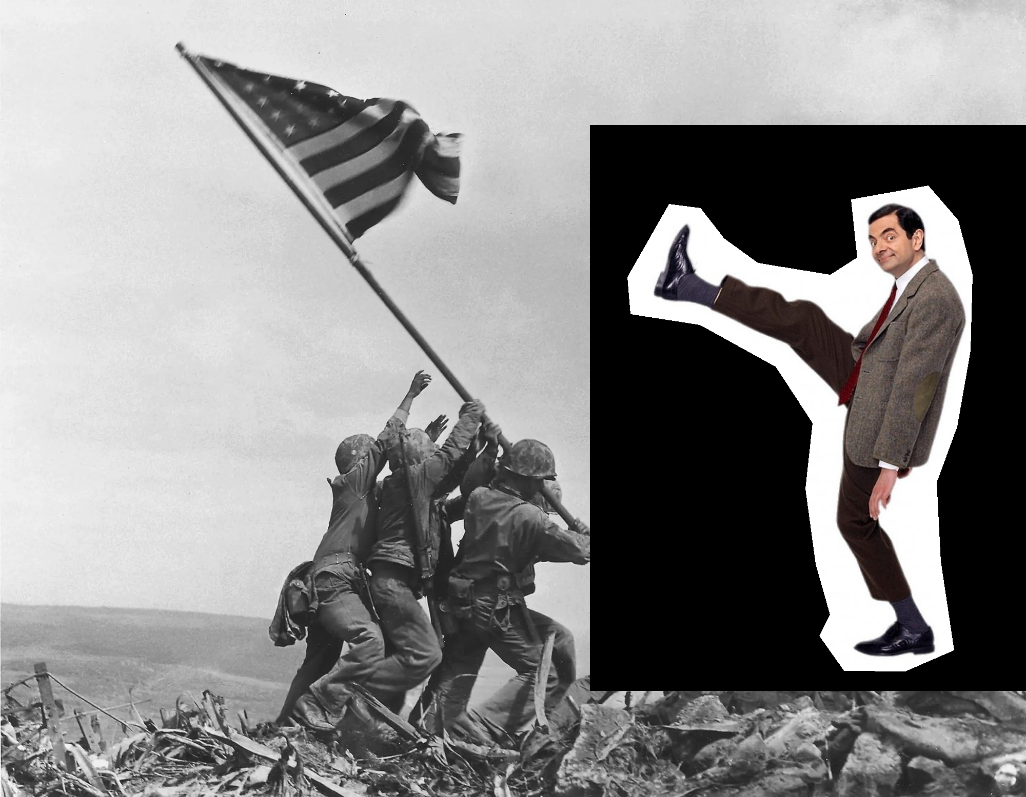 Another failure case of using mixed gradients. When using normal poisson blending, Mr.Bean is seamlessly pasted onto the historic photo. However, when using mixed gradients, the brightness of the source image becomes inconsistent. This is due to the small but relevant gradients in the target image, which tends to get amplified when taken the max gradients.